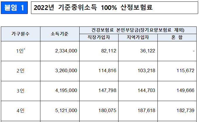 아래 기준 중위소득 100% 이하 기준표를 첨부해 두었습니다. 본인이 내고 있는 보험료가 얼마인지 모른다면 건강보험공단 홈페이지 통해 알 수 있으며, 인터넷 사용이 어렵다면 1577-1000으로 연락하여 본인이 납부하고 있는 건강보험료가 얼마인지 확인할 수 있습니다.