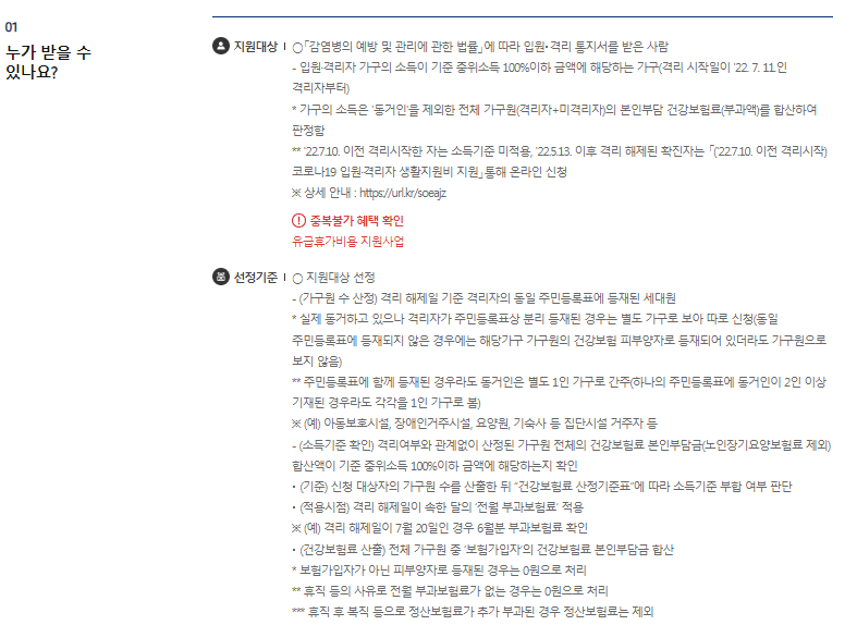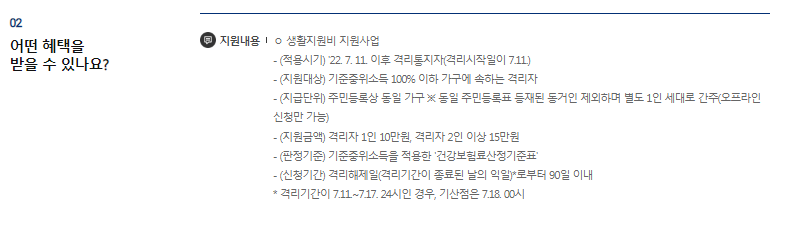 - 격기자는 1인 10만 원, 격리자 2인 이상 15만 원 지원