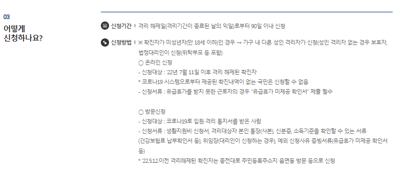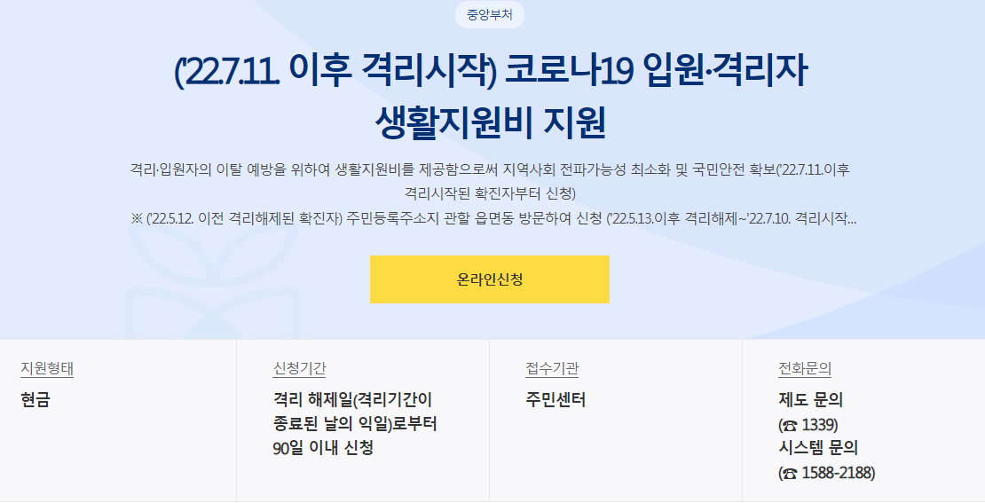 - 2022.7.11 이후 격리 통자부터 적용이 되며 기준 중위소득 100% 이하 가구에 속하는 격리자만 지원 대상임.
