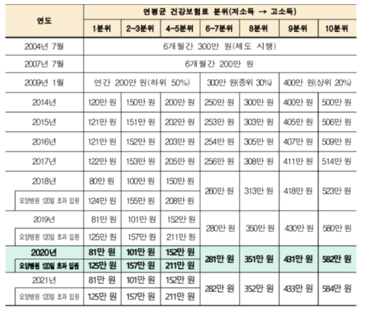 - 사전급여 : 동일 요양기관에서 진료를 받고 발생한 당해연도 본인부담금 총액이 2020년 기준 582만 원(2019년 580만 원)을 넘는 경우 환자는 582만 원까지만 부담하고, 그 넘는 금액은 병원, 의원에서 공단으로 청구합니다.※2020.11부터 요양병원 사전급여 적용제외